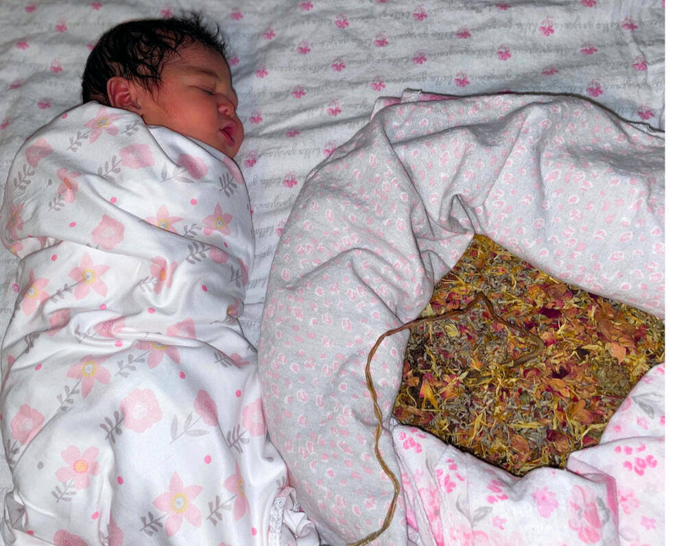 My mindset is rooted in honoring the body’s natural systems by nurturing and supporting it as it does what it was created to do. I was called to birthwork after my second birthing experience six years ago, which led me to Sista Midwife’s Doula Program, where I completed my training in New Orleans, Louisiana. This is a picture of my youngest womb fruit resting in bed with her placenta attached and dressed in a blend of herbs I picked for it. We hired a Doula for this pregnancy and it opened space for me to fully enjoy my baby and create sweet moments like this in the comfort of my home.